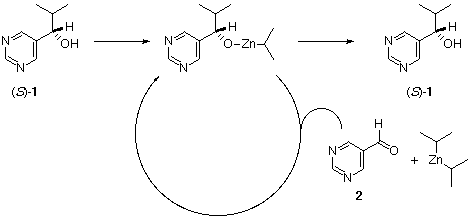 アルデヒド2とアルキル亜鉛を反応させてアルコール1を得る反応がある。通常の条件では生成する1は当然ラセミ体だ。ところが、ここに触媒量のキラルな(S)-1を添加してやると、(S)-1とアルキル亜鉛が結合したキラルな活性中間体が生成し、そこから2にアルキル基が与えられて1が生成する。このとき、中間体はキラルなので生成する1はキラルな(S)-1となる。反応によって活性中間体からアルキル亜鉛がはずれてもとの(S)-1にもどるが、また新たにアルキル亜鉛と結合して活性中間体が再生される。この繰り返しによって、少量の(S)-1の添加で、2から(S)-1を効率よく合成できるのである。実際には、最初に光学純度5%((S)-体が(R)-体より5%だけ過剰な混合物)の1を添加することで生成物1の光学純度は39%に上昇し、その光学純度39%の1を触媒にすると次には光学純度76%の(S)-1が生成した。