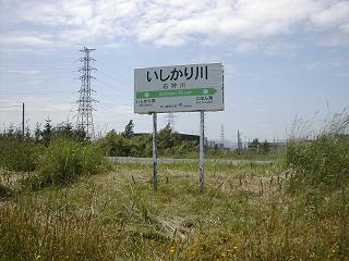 学園都市線石狩川橋梁のたもと、石狩川左岸の堤防に立つ川名標。 様式はJR北海道の駅名標にそっくり。よく見ると隣駅方向を示す黄緑色の帯が一方向きになっているのがいかにも川らしい。 裏側もちゃんとなっていた。 これがお手本のJR北の駅名標。