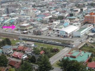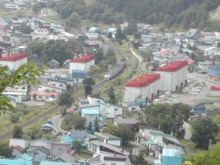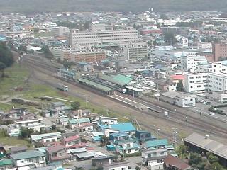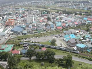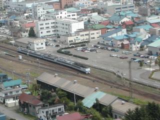 遠軽のシンボル、瞰望岩(がんぼういわ)頂上から望む遠軽駅構内。左上方が廃止になった中湧別方面、右下方が旭川・北見方面。上りオホーツク4号が発車を待っている。左手の側線にキハ40が留置されている。画面左端にターンテーブルが見える。