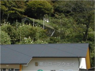 土讃線箸蔵駅から国道を歩いて7分ほどの登山口駅。瀟洒な駅舎は新しい。はいって右手に改札口があり、一旦外へ出て右側の乗り場から乗車する。ところで、屋根とロープの間に斜めに何かの遺構があるのがわかる。
