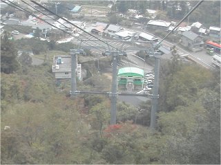 発車して登って行くところ。正面の緑色が登山口駅。支柱のすぐ左手の白い四角い建物が旧駅舎。