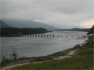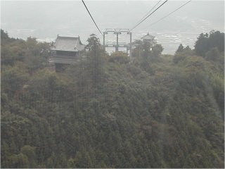 讃岐山脈を越えた土讃線がはるか下方に吉野川を望みながら下って行き、大カーブで180度方向転換して吉野川を渡り阿波池田にすべりこむあたりは、四国でも有数の雄大な鉄道車窓です。その吉野川を見下ろす山肌にへばりつくように箸蔵寺ロープウェイがあります。ここは日本で最初の珍しいフニテル式複式単線交走式ロープウェイとして有名です。長い名前ですが、要するに1本のロープを二重に回して(複式単線)、搬器(ゴンドラ)の天井から2方向に伸びた握索器で両手でぶらさがるように(フニテル式)して、山麓と山頂から交互に同時に発車する(交走式)システムです。現在は山麓側の登山口駅から山頂側の箸蔵寺駅まで1本のロープウェイですが、1999年に架け替えられるまでは途中の仁王門で分割されていて、赤鳥居〜大門(仁王門)〜箸蔵寺(本坊)と2本のロープウェイを乗り継いでいました。ロープウェイの乗り継ぎといえば宮島を思い出しますが、ここは仁王門から始まる参拝路の都合だったのでしょう。という予備知識はあったものの、実際に行ってみたらもっと複雑怪奇な歴史があってびっくり。2線乗り継ぎ式の時代には、山麓側にロープウェイと平行してリフトが併設されていたそうです、写真には撮れませんでしたが支柱の台座跡が搬器から見えました。さらに、ロープウェイ架設前の戦前にはなんとケーブルカーがあったとか。山麓にはその遺構が今も残っています。うむむ、おそるべし箸蔵寺。怪しげな乗客に貴重な情報をお教えいただきましたロープウェイ乗務のお嬢さんありがとうございました。