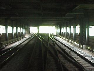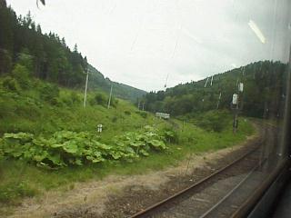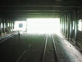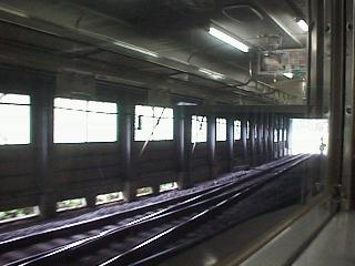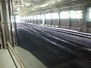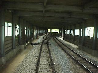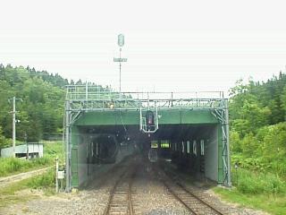 順行で発車。三たびスノーシェッドにはいり、こんどは右手に待避線を分岐して本線を下る。