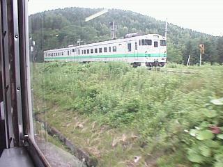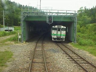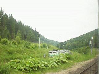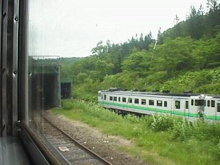 スノーシェッドを出て右手に二本ある待避線の右側に入ると、ほどなく左手の本線を4662D(キハ402連)がゆっくりと上ってくる。