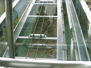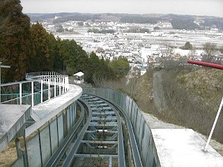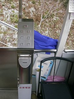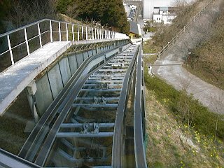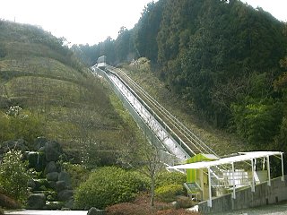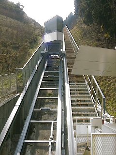 ゴルフ場などの斜面を上り下りする簡易型の乗り物は斜行エレベータとよばれますが、ここのものはかなり大掛かりでケーブルカーのようです。ケーブルカーと異なるのは、車体が常に水平になっていて内部に段差がないことと、2台がつるべ式に交走するのではなく、片側がカウンターウェイトになった1台の往復形式で(青函トンネル竜飛や鞍馬山のケーブルカーはこうですが)、ダイヤなしの随時運行という点でしょうか。