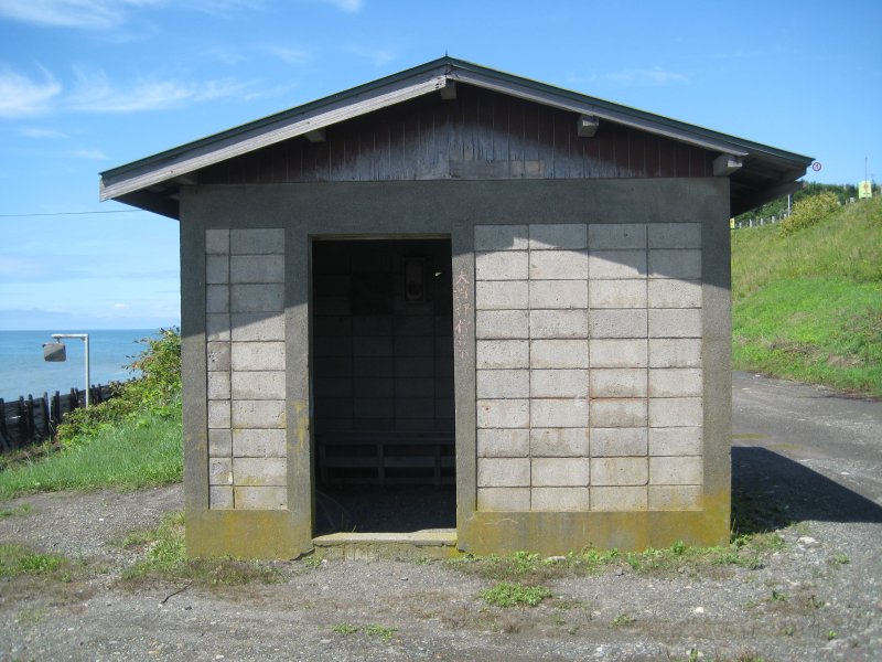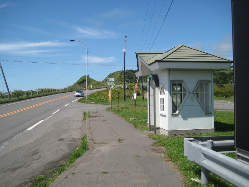 バス停から反対側厚賀を経由して苫小牧方面を見たところ。右手の瀟洒な待合所はきれいに清掃されていて、中のイスもきれい。大狩部駅待合室とは大違い。