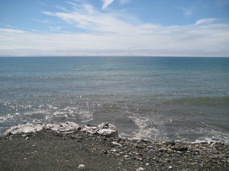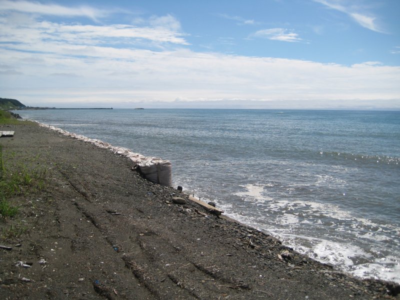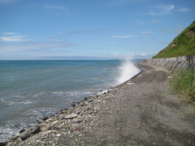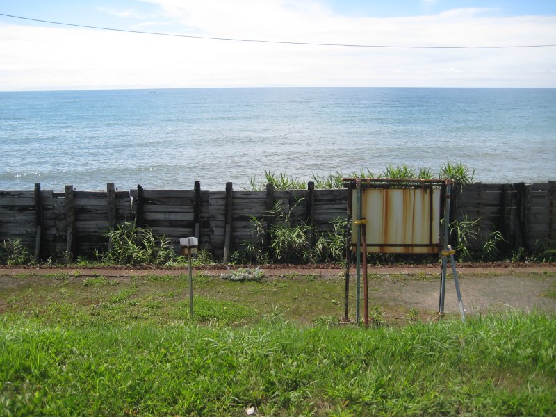 海岸から反対側の節婦方面を望む。護岸対策がしてある上を歩いて海岸沿いにたぶん節婦まで行ける。ただし大狩部駅の先すぐに大節婦川橋梁があるのでそこだけは迂回が必要(道路がすぐ)。