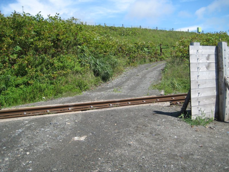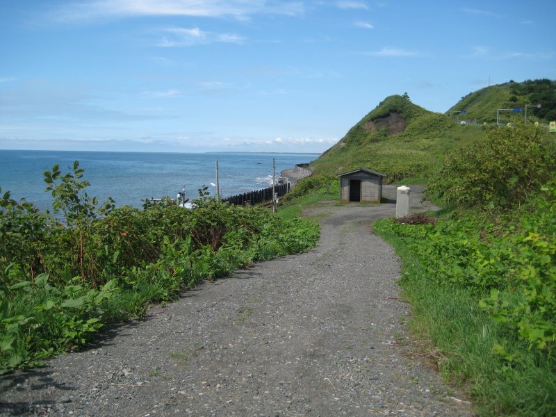 ホームから上り厚賀よりに線路を降りて歩いたところにその道路の交差部があり海側は防波柵が途切れている。上方は扉があって広場へつながっている。