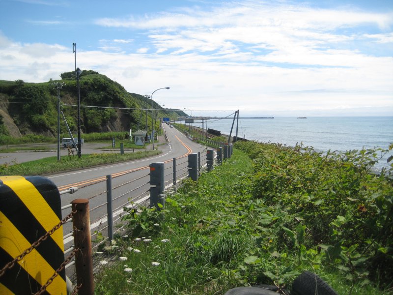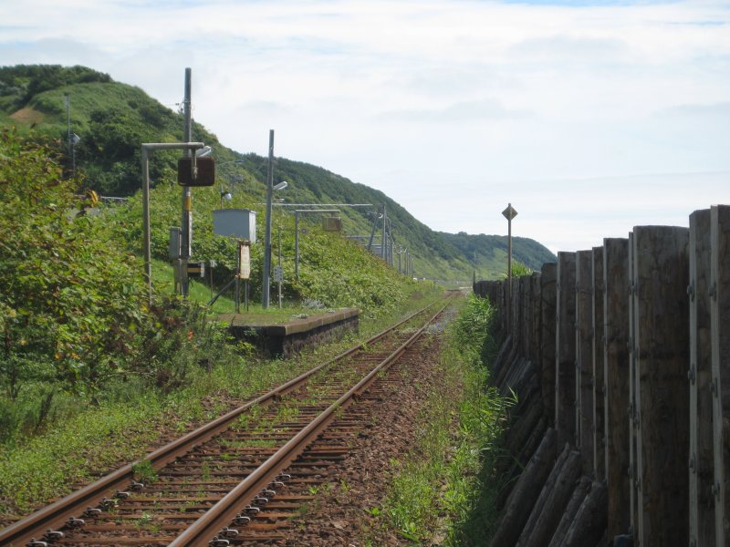 ホームから上り厚賀方面を望む。小山が迫っていて先が見えない。右上方に国道が山を越えているのが見える。ホームの少し先に路盤の色が薄くなっているところが、右手広場から降りてくる道路が横切っているところ。そこは防波柵が途切れていて海側に出られる(後述)。