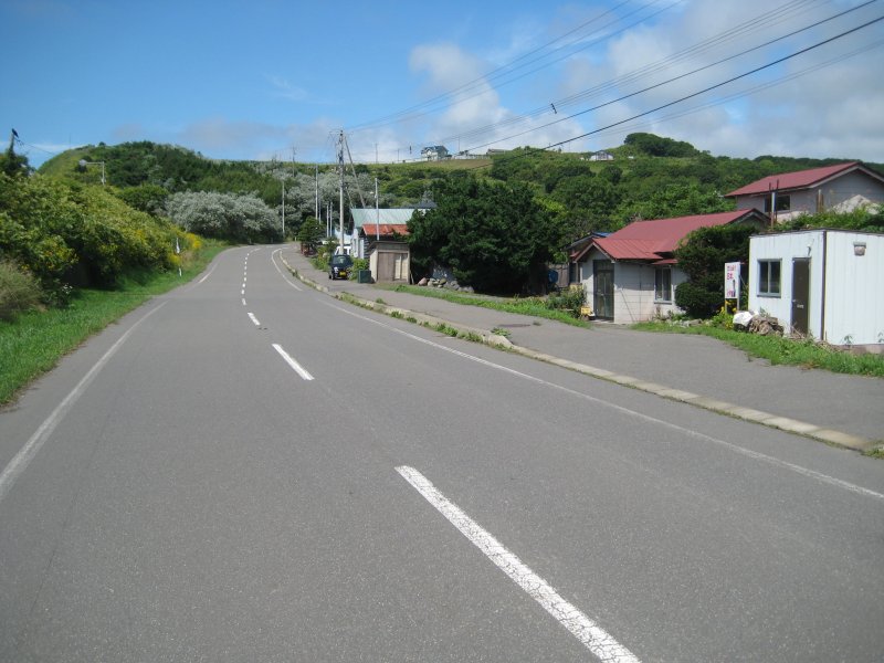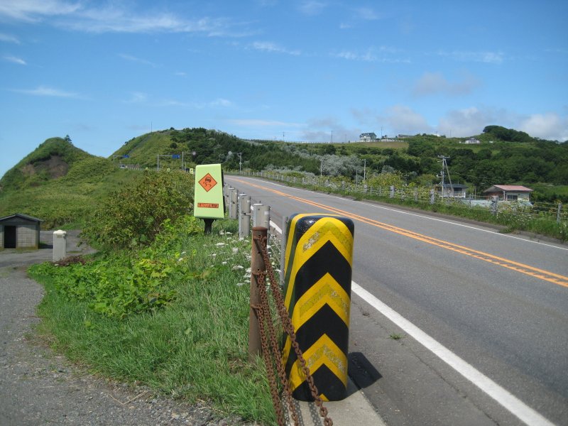 反対側の厚賀方面は小山を越える上り坂でトド岩高原へと向かう。右上に牧場。