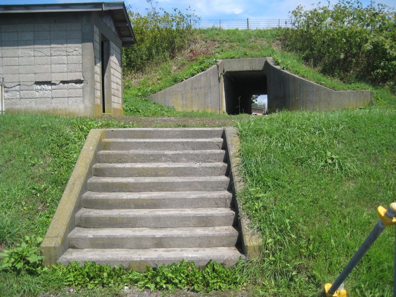 ホームから石段の先の広場とトンネル、左手の待合室の位置関係。トイレはフレーム外の右手にある。