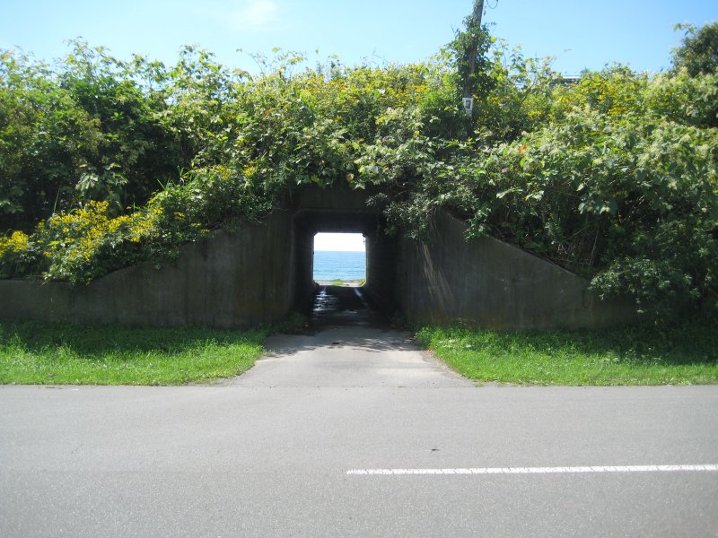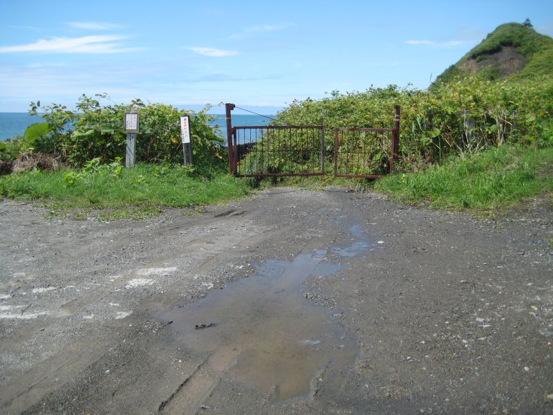 広場から右手の国道へとつながる道路の反対側、左手は海岸へと降りて行くが、扉で閉じられている。人は横の隙間を通れる。