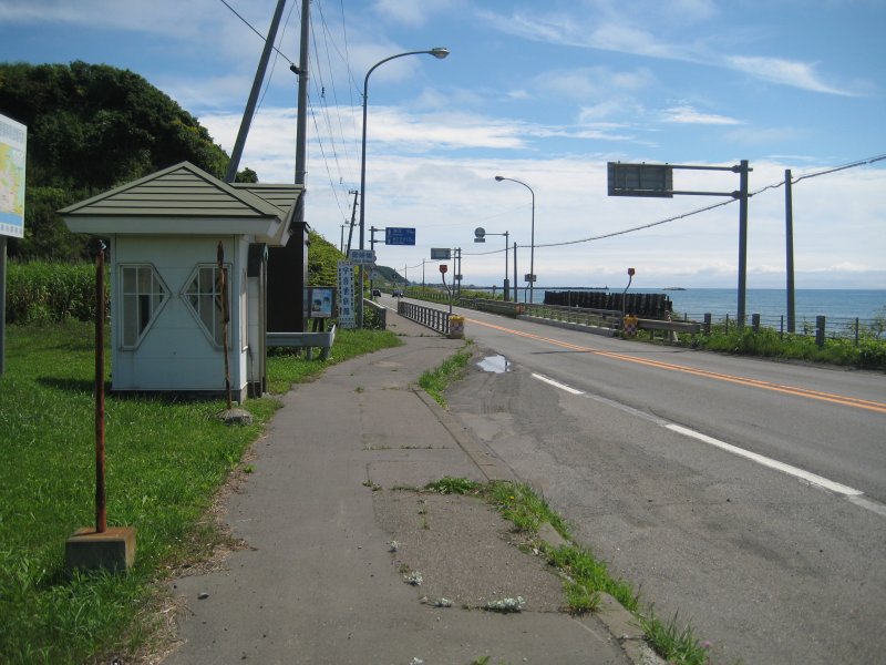 国道からの取り付け道路の入り口から節婦方面を望む。右手の防波柵が途切れている部分が大節婦川橋梁。左手の国道の脇にバス停と待合所が見える。