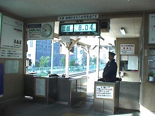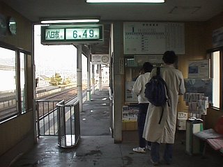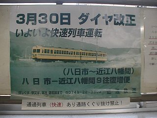 近江八幡駅。この日(3.30)から運転開始の快速八日市経由彦根行きの改札。改札氏がしきりに肉声で快速運転の注意喚起をしていた。