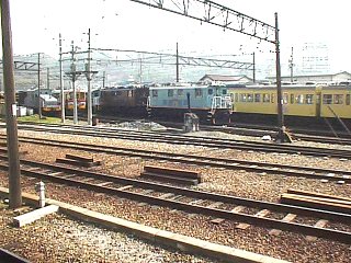 彦根駅構内には電気機関車などさまざまな車両が留置。