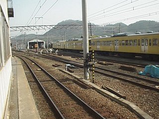 高宮駅本線ホームから多賀支線ホームに停車中の223号を見る。扇形の配線になっている。