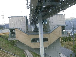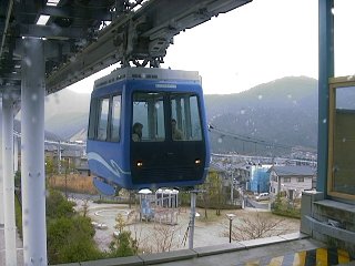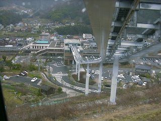 車体の見かけはロープウェイそのもので、曳索に引かれて動くところも同じですが、ロープにぶら下がるのではなくて軌道に懸垂しているところは懸垂式モノレールのようでもあります。他に類をみないのでどういう分類にしたらいいんでしょうね。まあスカイレールというんでしょうが(笑)。