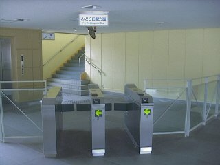 みどり中央駅改札口。改札機に均一150円の乗車券を投入すると券は回収されてしまい出てこない。降りた駅ではそのまま出られる。