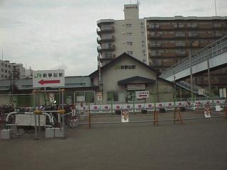 使用停止になった旧駅舎。立ち入り禁止の柵がはりめぐらされている。仮駅舎は左手方向にある。右側に水色の歩道橋(線路北側への自由通路)が見える。