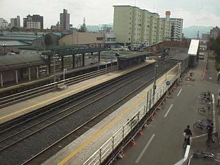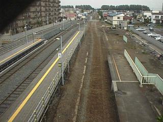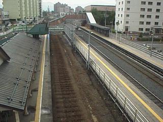 歩道橋上から上り方向新川方面を望む。中央右手に仮ホームがあり、正面の仮跨線橋で仮下りホームへ渡る。仮上りホームへは旧線跡を横切る通路が仮設されている。真下に旧上り線跡とホーム。左手の屋根は旧駅舎の上屋。旧下り線は仮上り線(中央の黄線ホーム)の位置にあった。