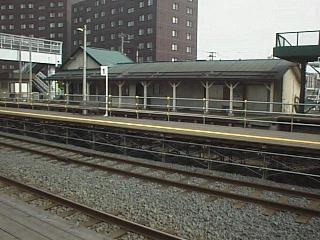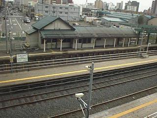 仮下りホームから上りホーム越しに見た旧駅舎。