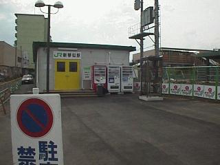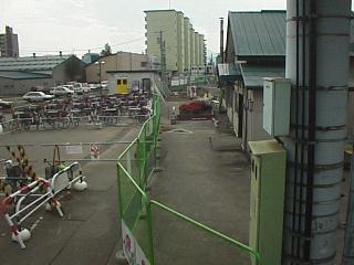 旧駅舎の横手の歩道橋上り口から見た仮駅舎。黄色二枚扉が入り口。手前は自転車置き場。