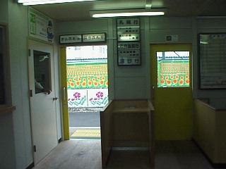 仮駅舎内の改札口。行灯式の案内表示は旧駅のもののよう。