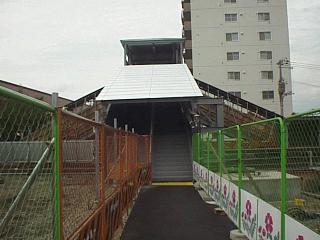 仮駅舎から入場して下りホーム(太平方面)への跨線橋上り口。左側半分はまだ閉鎖されている。線路を渡って左手へ降りる自由通路らしい。