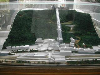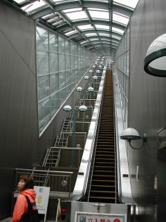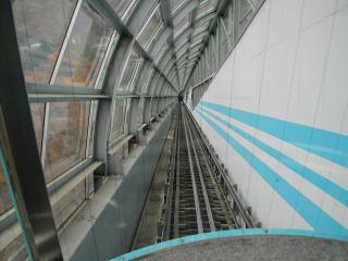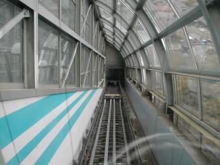 シェルター内部。真中に長大エスカレータ(朝晩のみ運転)、その両側が斜行エレベータで、ケーブルカーのようなつるべ式運行をしている。