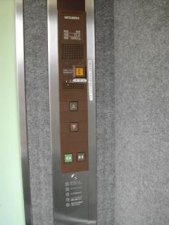 搬器内の操作盤。まさにエレベータそのもの。三菱製で定員15名。