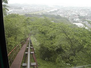 船岡城址公園は東北本線船岡駅から歩いて10分くらい。有名な桜の名所だそうだ。スロープカーは中腹と山上の平和観音のそばを結んでいる。全長305m。