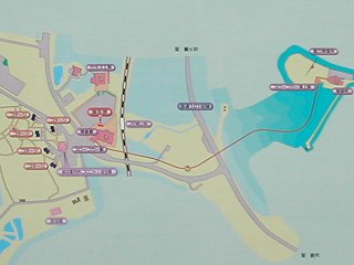こちらはウェスパ椿山。赤い線が路線。五能線の駅近くの物産館横と右手の山上展望塔を結んでいる。全長561m。