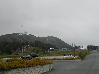 路線を遠望したところ。左手の山上展望塔まで登る。中央部に線路が見える。展望塔のすぐ左にあるのは風力発電の風車。