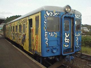 津軽中里駅で発車を待つ落書き列車キハ22028。