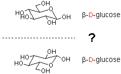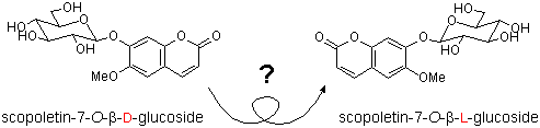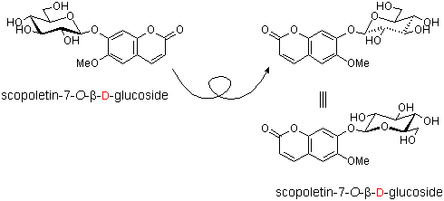 うっかりするとだまされてしまうが、これはもちろん立体的なはずのいす形配座の六員環を単なる平面とみなしてしまったための間違いだ。つまり、上記の配糖体は180度の反転ではなく鏡に映した形になっている。