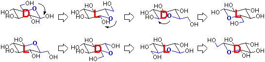 むむ。酸素の位置がずれたらどう考えればいいのだろうか。これも実は落ち着いて考えれば難しくない。たとえば基本形のD-グルコース構造から時計回りに酸素の位置をひとつずらしてみる。するとできるのはL-グルコースになる。つまり、ジグザグ構造のいす形配座では隣同士の原子が上下上下の関係になるので、ひとつ隣にシフトすると不斉中心がひっくり返るからだ。