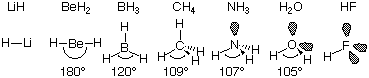 分子の形を決める要因はいろいろあるが、結合電子対や非結合電子対の反発はそのひとつとして重要である。LiからFまでの第2周期元素7種の水素化物に例をとると、結合電子しかもたない水素化ベリリウム(BeH2)や水素化ホウ素(BH3)*は平面状なのに対し、非結合電子をもつアンモニア(NH3)や水(H2O)は立体的である。BeH2では結合電子対間の反発のみによって2本のH-Be結合は180度反対を向き、同様にBH3では3本のB-H結合は平面3方向(120度)に向いている。それに対し、アンモニアは非共有電子対との反発でH-N-H結合角は107度、同様に水のH-O-H結合角は105度となる。
