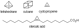 三員環のシクロプロパンや四員環のシクロブタンはひずみの大きい化合物の代表だが、世の中にはもっともっとひずみの大きな化合物がたくさん存在する。そういったひずみの大きな化合物は当然不安定なので作るのが難しく、合成化学者の大きな目標となる。シクロプロパン環をつなぎあわせた正四面体構造の炭化水素テトラヘドランC4H4は合成困難な夢の化合物のひとつであったが、すでに合成が達成された。また正方形をつなぎあわせたサイコロ形のキュバンC8H8も合成されている。キュバンは大きなひずみエネルギーをもっているため、その誘導体は爆薬に利用可能とか。