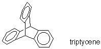 つまり、[2,3],[5,6],[7,8]-tribenzobicyclo[2.2.2]octane ですね(命名法については突っ込まないように(^^;)。平面に描くと面妖ですが、立体的には三個のベンゼン環が三枚羽根の歯車のように配置した分子をイメージしてください。上の図を上からみると、ベンゼン環がちょうど120°の角度で三個配置しているわけです。これが理解できないと先へすすめませんから、精一杯想像をたくましくしてくださいね(^^;。