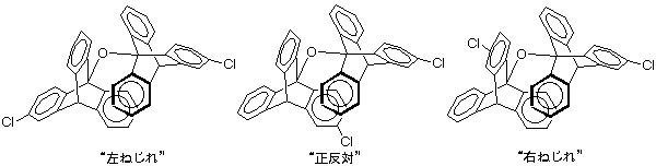 さてこの歯車が噛み合った状態を考えると、一方のトリプチセン単位の印をつけたベンゼン環に対して、他方の印つきベンゼン環が噛み合う位置は三通り考えられます。つまり、右ねじれ(右60°)、左ねじれ(左60°)、正反対(180°)です。この三通りの状態がいりまじってくるくる回転しているのです。「右ねじれ」と「左ねじれ」は互いに鏡像体の関係にあり、それに対して、「正反対」はねじれをもたないメソ体ということがいえます。