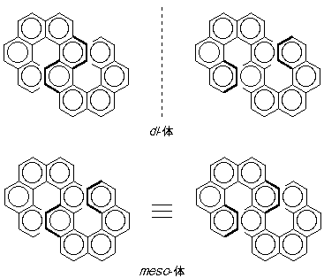その一つは、「S」字型のもので、たとえば10個のベンゼン環からなる下のような分子があります。この分子は両端の重なりぐあいによってdl-体とmeso-体が存在するそうです。