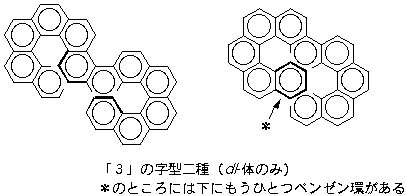 もう一種のダブルヘリセンは、「3」の字型に二つのらせんがつながった分子で、たとえば次の二種のようなものがあります。こちらは両端が同じ側に向いているものは、得られず(立体障害でしょうね)、互い違いになっているものだけが知られています。ややこしいのは、この「3」型は、この互い違いがdl-体になることです。う〜ん、頭が痛い(^^;。