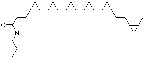 米アップジョン社の研究グループがあるバクテリアの培養液から単離した一種の脂肪酸アミドなのですが、ご覧のように恐竜の背中のようにシクロプロパン環がならんでいます。生合成的には、C18のポリエン酸が生成したあとでメチオニン由来のC1ユニットが順次導入されていくと推定されています。なんで途中一ヶ所飛んでいるのでしょうね?(^^;