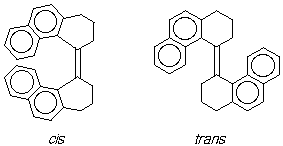 すなわち、はしのベンゼン環一個が飽和化したフェナントレンを対称に二重結合で結んだ形です。シス体の方は向き合ったナフタレンユニット同士がねじれて上下に重なっており、軸不斉によって二種の鏡像異性体があります。また、トランス体はナフタレンユニットと相手方のシクロヘキサン環の間でやはりねじれが発生し、こちらは、上上、下下の一対の鏡像異性体と、上下というメソ体があります。