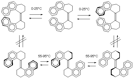 環の一部が重なっているにすぎないトランス体に比べ、シス体はまるまるベンゼン環一個分重なっていますから、それがすりぬけて異性化するのは困難なように思えますが、実際にはシス体の方が低い温度で容易にラセミ化するのが不思議です。しかもこのラセミ化反応は片側のユニットが一回転、つまり二重結合が一旦きれてビラジカルのようになり、トランス体を経て進行するのではないことが明らかになっています。