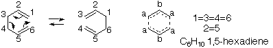 で、この反応が可逆的に速く進行すると、出発物と生成物は平衡になって区別できなくなります。すなわちC-1,C-3,C-4,C-6は等価になります。NMRでは炭素も水素も2種類(C-1,3,4,6の組とC-2,5の組)しかなくなってしまうわけです。