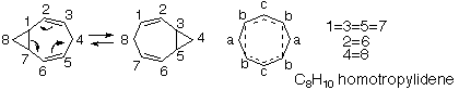 ここまででもなかなか面白いんですが、次にヘキサジエンの開いた端(C-1,C-6間)をメチレンで橋架けして結んだ形を考えてみます。左右対称でないと等価になりませんから、同時にC-3,C-4間にも同じ橋架けをしておきます。できた分子が次のホモトロピリデンです。図のC-4とC-8が新しく付加されたメチレンで全体はC8H10となります。