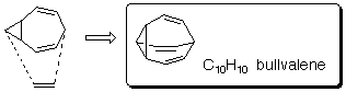 次に三次元展開をします(^^;。ホモトロピリデンの構造をよく見ると、シクロプロパン環の三角形の2個の炭素と反対端の炭素を2本のエチレン鎖(−CH=CH−)でつないだ形であることにお気づきでしょうか。三角形の残った炭素と端の炭素をもうひとつのエチレン鎖でつないでやれば、三回対称のかご型の立体分子になります。それがブルバレンです。