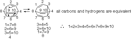 ここで、分子は三回対称構造ですから、各炭素(水素)の等価性をみてみると、末端の炭素以外はそれぞれ3個ずつの等価な組にわかれます。転位反応が十分速く進行し、出発構造と生成構造間が区別できなくなれば、両側の構造の等式が同時に成り立つことになりますから、結局、すべての炭素が等号で結ばれてしまいました(^^)。これはブルバレンC10H10のすべての炭素、すべての水素は等価であるということを表しています。事実、1H-NMRスペクトルでは十分温度が高ければ(100℃)、δ4.2ppmにシグナルが1本しか観測されないことがわかっています。
