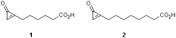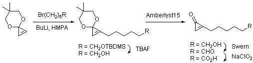 シクロプロペノン環自体はカルボニルの分極で2π芳香族性をもちますから、立体ひずみはともかくとして、安定要素がないわけではないですね。たとえば鎖の長い方の化合物は-20℃では2年以上安定だそうです(そんなに以前にとられてたのね(^^;)。